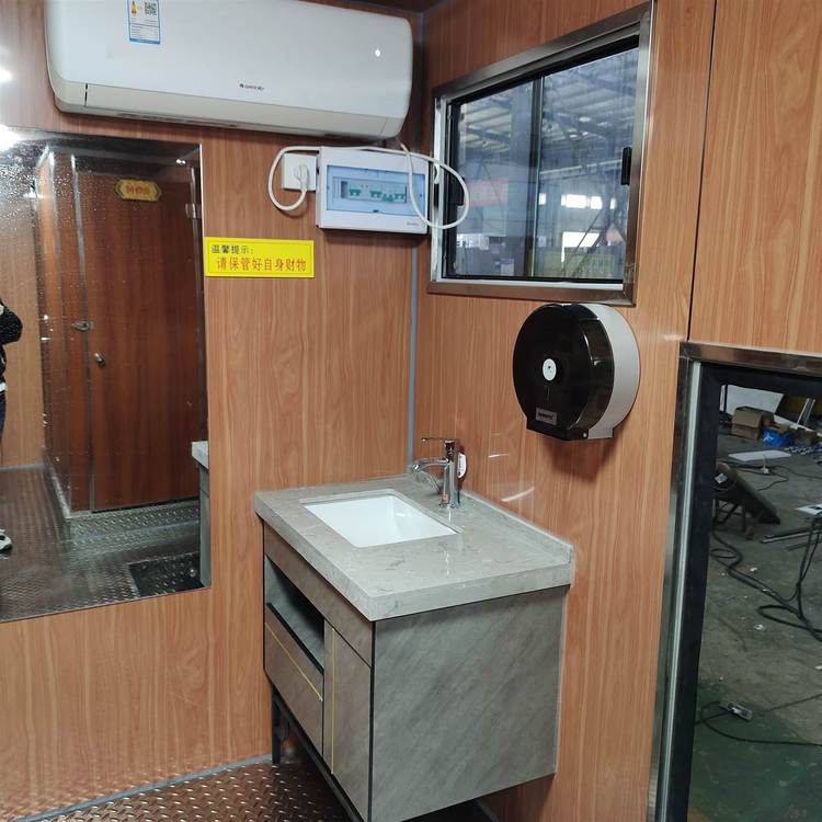 此款现代设计移动厕所,材质为三明治夹层结构,外冷轧钢板内UV板,墙体内部钢架置有保温材质,适合全国各地的气候环境。内置有排污管道、水流管道、照明通电设备,适合放在能接入水源、通电的环境。